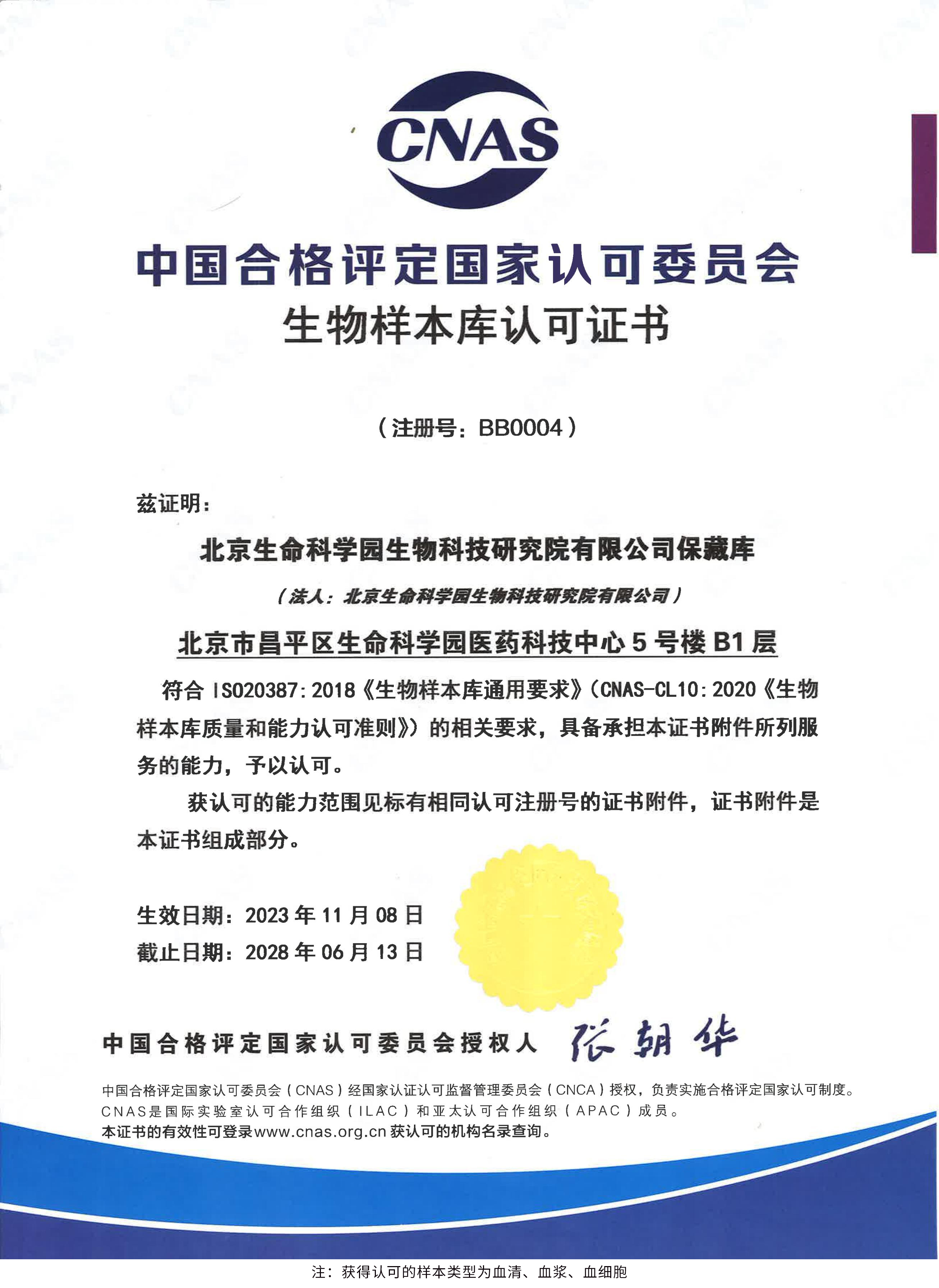 北京生命科學(xué)園生物科技研究院(以下簡(jiǎn)稱“北京生物樣本資源庫(kù)”)(Biobank of Life Science Park,簡(jiǎn)寫“BoLSP”)是一家由北京市科委和中關(guān)村生命科學(xué)園共同支持設(shè)立的第三方生物樣本庫(kù)公共服務(wù)平臺(tái),秉承北京重大疾病臨床數(shù)據(jù)和樣本資源庫(kù)(以下簡(jiǎn)稱“北京庫(kù)”)(Beijing Biobank of Clinical Resources,BBCR)十余年的發(fā)展成果,聚合眾多臨床樣本專家的專業(yè)共識(shí),致力于在生命科學(xué)、生物醫(yī)藥研究領(lǐng)域發(fā)揮銜接樣本資源持有者與研究者的橋梁作用,解決生物樣本資源開發(fā)上下游信息不對(duì)稱、資源共享困難等問題。研究院在北京中關(guān)村生命科學(xué)園昌平園區(qū)建立了2000㎡生物樣本庫(kù),最大存儲(chǔ)規(guī)模達(dá)1000萬份。研究院遵循CNAS-CL10:2020《生物樣本庫(kù)質(zhì)量和能力認(rèn)可準(zhǔn)則》,同時(shí)結(jié)合北京庫(kù)過去十年的工作經(jīng)驗(yàn)與教訓(xùn),建立了一套完善的生物樣本保藏質(zhì)量管理體系,從人、機(jī)、料、法、環(huán)、控多個(gè)角度,實(shí)現(xiàn)生物樣本保藏過程的全面質(zhì)量控制,先后獲得國(guó)家科技部頒發(fā)的人類遺傳資源保藏行政許可證書和中國(guó)合格評(píng)定國(guó)家認(rèn)可委員會(huì)(China National Accreditation Service for Conformity Assessment,CNAS)頒發(fā)的“CNAS認(rèn)可證書”。