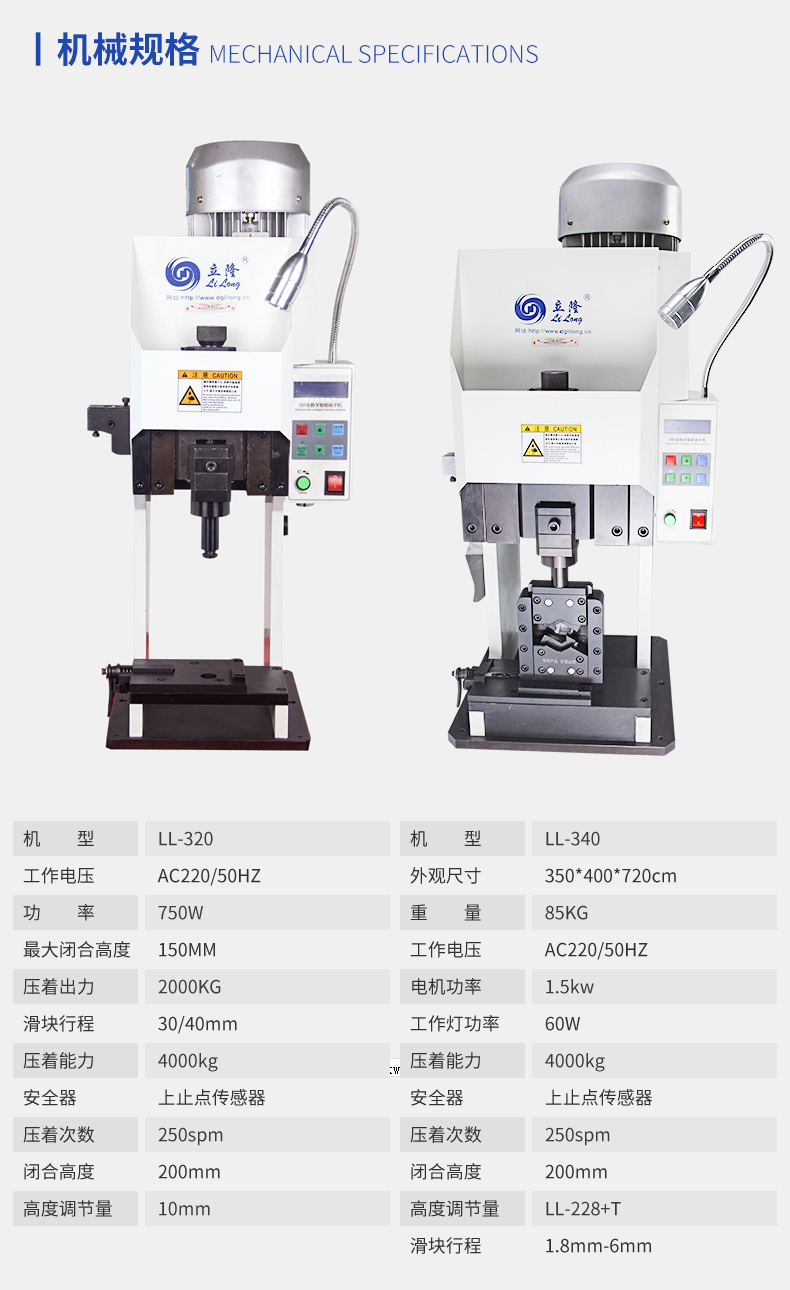 LL-320半自動超靜音端子機   產(chǎn)品說明:   1.采用先進的電子控制,配有高精度進口電磁離合器/制動器,動作敏捷、準確。   2.低噪音、耗電省、送料準、效率高。   3.更寬的高度調(diào)節(jié)范圍,更高的調(diào)節(jié)精度,節(jié)省壓接高度...