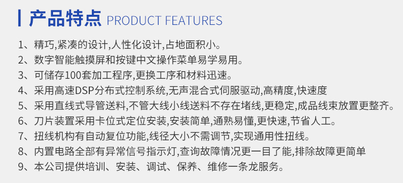 8.扭線機構(gòu)有自動復位功能,線徑大小不需調(diào)節(jié),施先通用性扭線。