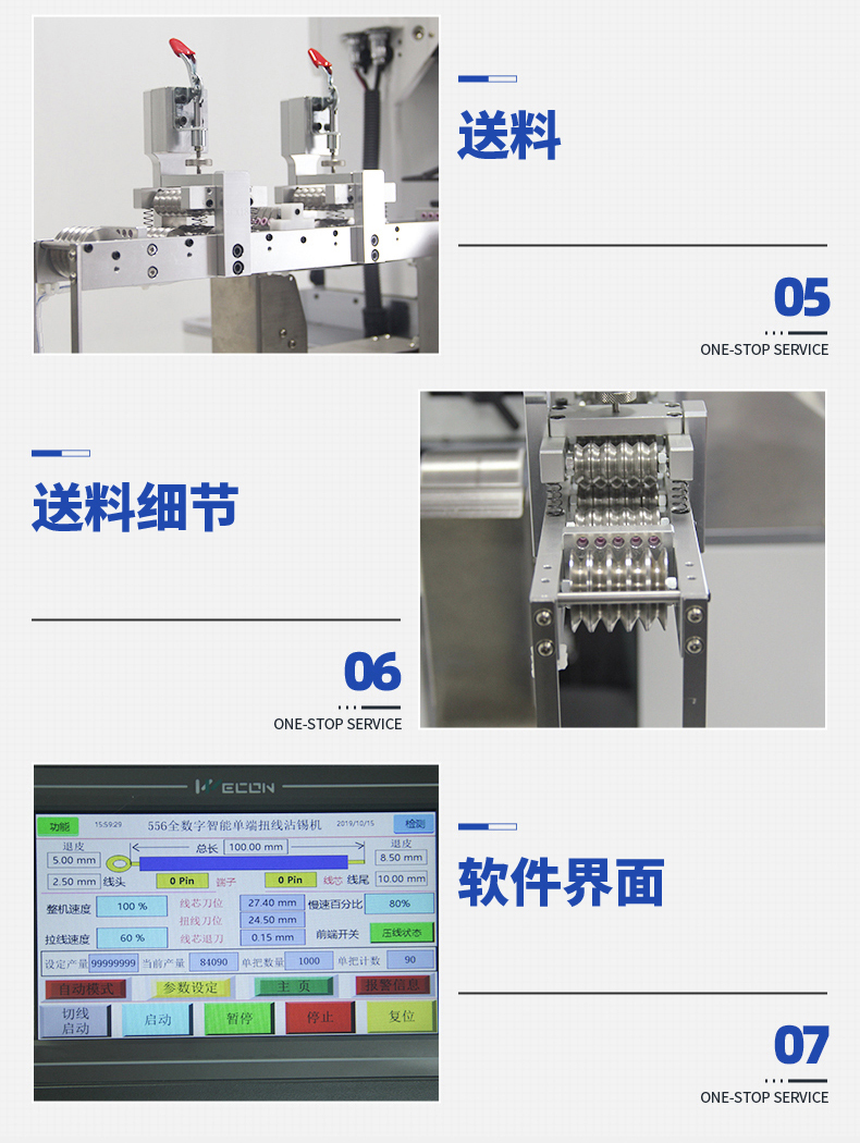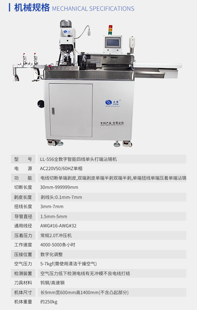 LL-556全數(shù)字智能五線單頭打端沾錫機   產(chǎn)品說明:   1.精巧,緊湊的設(shè)計,極佳人性化設(shè)計,占地面積小。   2.數(shù)字智能觸摸屏和按鍵中文操作菜單易學易用。   3.可儲存100套加工程序,更換工序和材料迅速。  ...