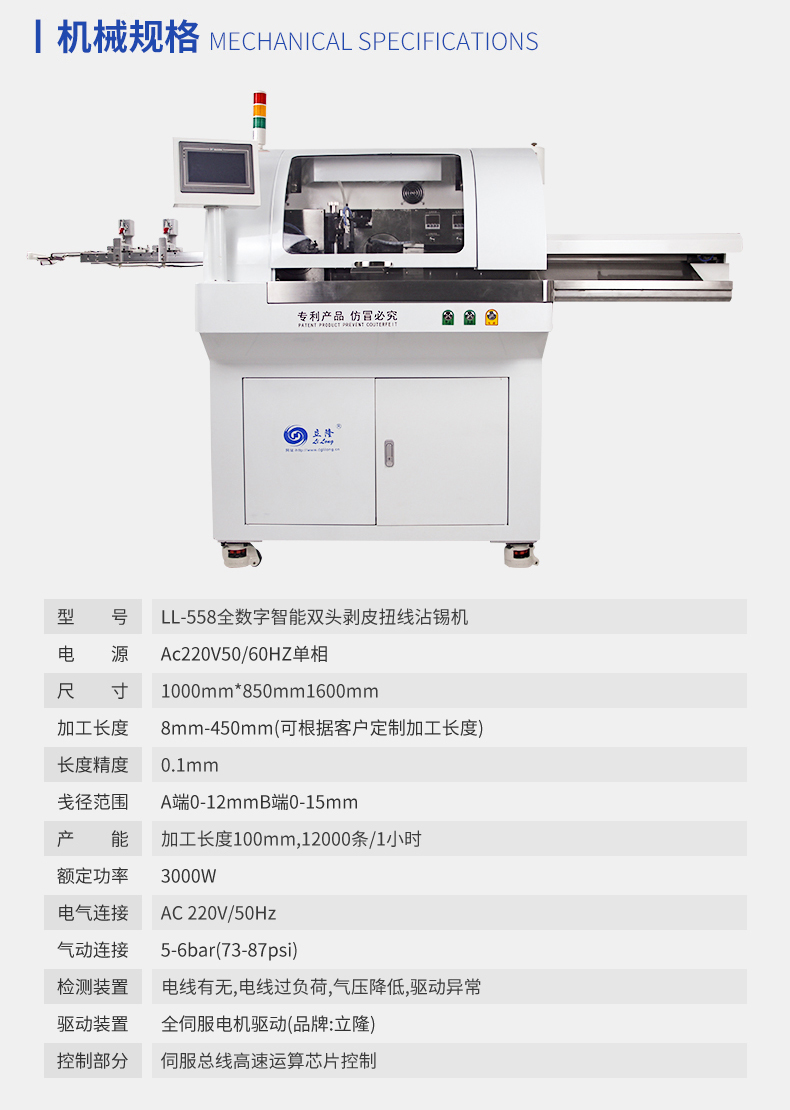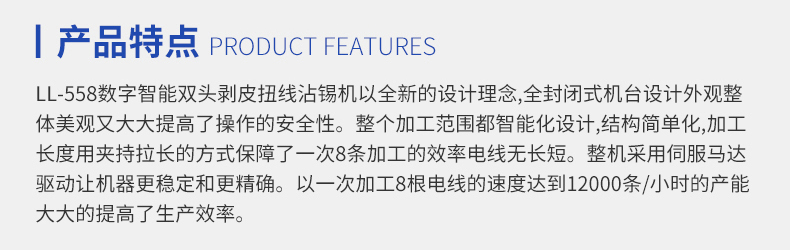 LL-558數(shù)字智能雙頭剝皮扭線沾錫機(jī)以全新的設(shè)計(jì)理念,全封閉式機(jī)臺(tái)設(shè)計(jì)外觀整體美觀又大大提高了操作的安全性。整個(gè)加工范圍都智能化設(shè)計(jì),結(jié)構(gòu)簡(jiǎn)單化,加工長(zhǎng)度用夾持拉長(zhǎng)的方式保證了一次8條加工的效率電線無(wú)長(zhǎng)短。整機(jī)采用伺服馬達(dá)驅(qū)動(dòng)讓機(jī)器更穩(wěn)定和更精確。以一次加工8跟電線的速度達(dá)到12000條/小時(shí)的產(chǎn)能大大提高了生產(chǎn)效率。